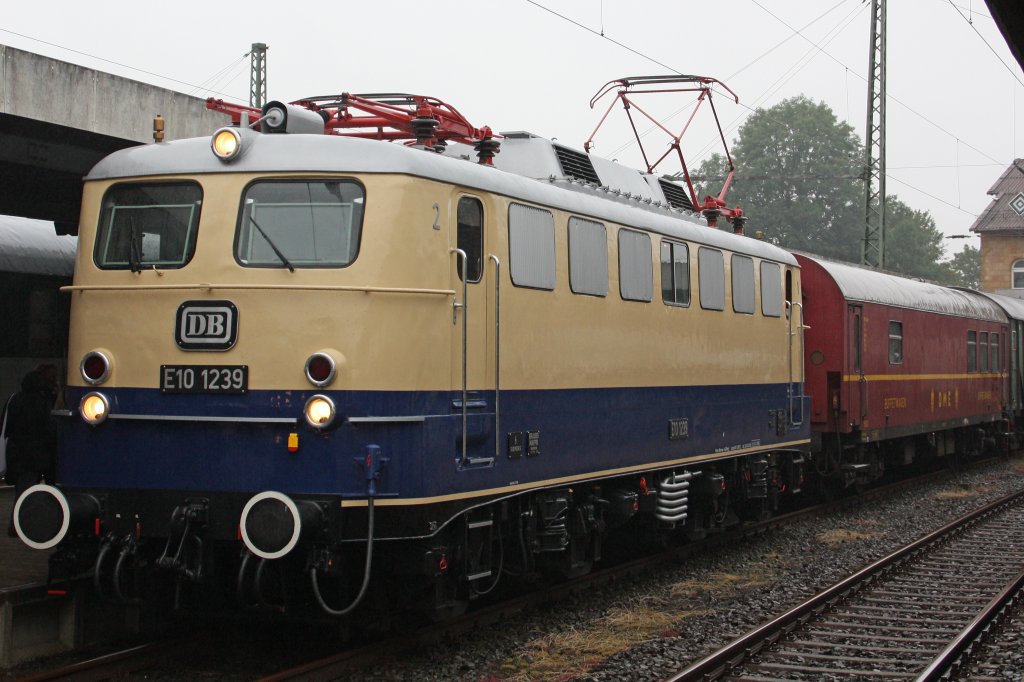 Die E10 1239 war am 3.7.11 beimVivat Viaduktfest in Altenbeken.Momentan ist die Lok in Dessau und bekommt eine neue HU :)