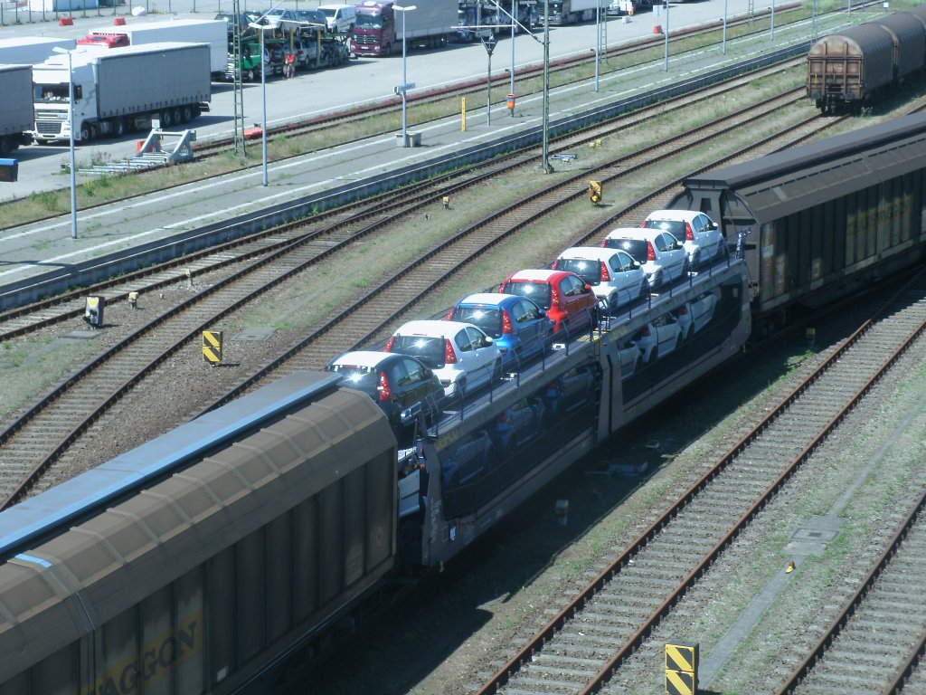 Dieser französsische Autotransportwagen,beladen mit französsischen Kleinwagen,wurde am 06.Juli 2011,in Mukran auf das Fährschiff geschoben.
