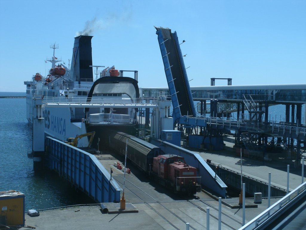 Durch die Fensterscheiben von der Fussgängerbrücke in Mukran konnte ich,am 06.Juli 2011,298 325 fotografieren als Sie die letzten Wagen auf das Fährschiff "Sassnitz" schob.