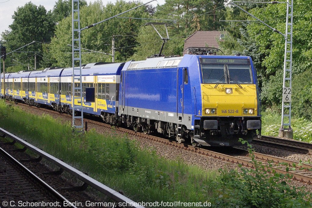E-Lok 146 522-8 mit dem Interconnex aus Warnemünde am S-Bahnhof Borgsdorf vorbei fahrend.