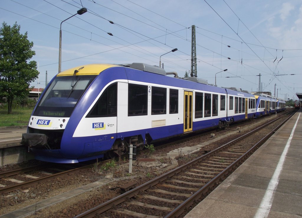 Eine Dreifachtraktion LINT 41 des HarzElbeExpress steht am 9. Juli 2011 als HEX nach Halberstadt im Magdeburger Hbf.