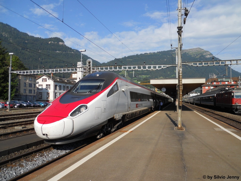 ETR 610 006 am 6.7.2011 in Arth-Goldau als EC153 nach Venezia St. Lucia. Diese Szenerie mit dem ETR610 vor der Rigi wird bald wieder Vergangenheit sein, denn die Trenitalia hat beschlossen ihre ETR 610 nicht mehr in der Schweiz einzusetzen. Um den Verkehr am Simplon abwickeln zu können, wird künftig wieder ein ETR 470 auf dem EC 153 fahren.