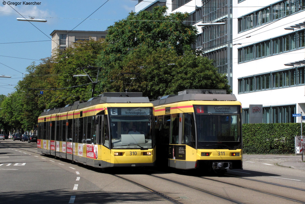 Interessante Begegnung: Wagen 310 trifft Wagen 311 kurz vor der Station Hauptfriedhof. Karlsruhe, 09.07.2011.