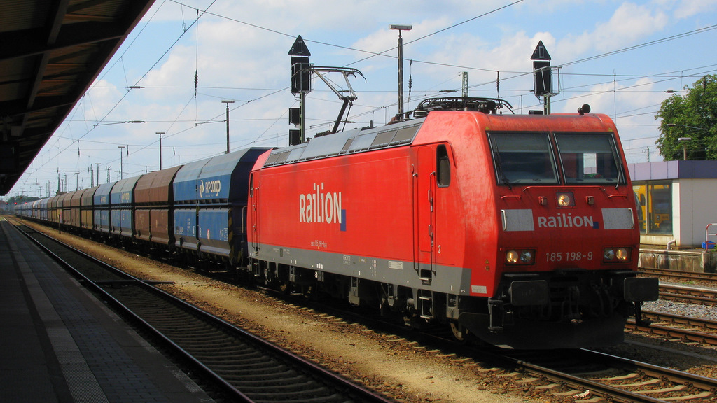 Eigentlich wartete ich am Vatertag 2011 (2. Juni 2011) auf den mit 01 533 bespannten Dampfsonderzug nach Kulmbach, doch er kam nicht, so entschloss ich mich am Rother Bahnhof noch weiter zu fotografieren... Dann das typische Anfängerglück: 185 187-2 mit ihren Güterzug und paralleler Einfahrt der 143 592-4 mit der S-Bahn aus Nürnberg (Altdorf) in den Bahnhof Roth
