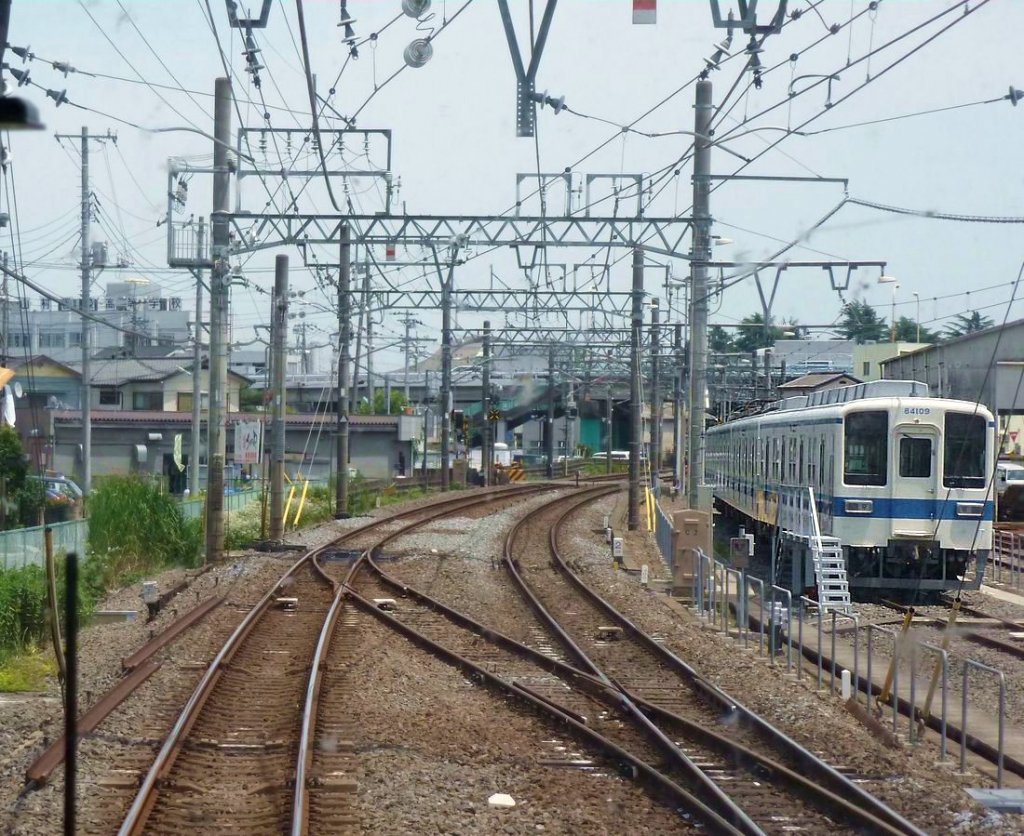 Tôbu Serie 8000, der klassische Tôbu-Lokalverkehrszug mit Längssitzen: Auf der Fahrt nach Tokyo begegnet Zug 81 109 (mit Endwagen 84 109) im Abstellgleis von Sakado. Da alle japanischen Bahnen Hoch-Bahnsteige zum ebenerdigen Einsteigen besitzen, muss im Abstellgleis für den Wagenführer eine kleine Plattform zum Ein- und Aussteigen hingestellt werden, wie auf dem Bild gut zu erkennen. 24.Juni 2011. (Aufnahme durch die verglaste Führerstandrückwand eines Zuges)