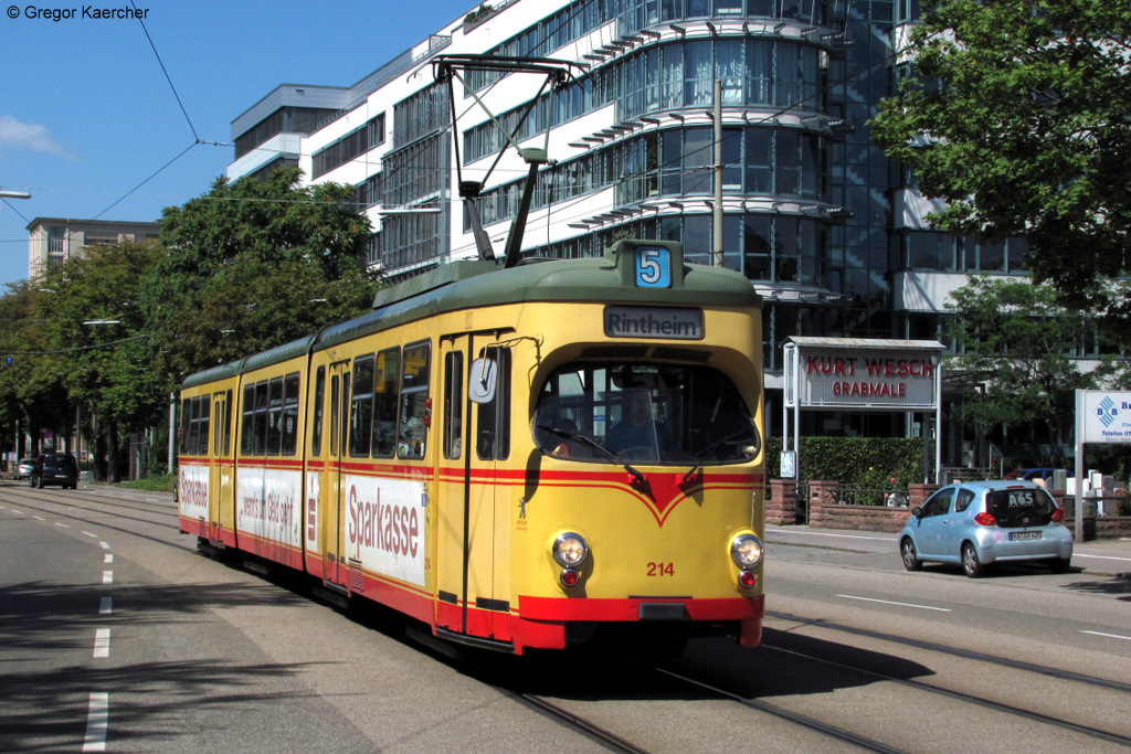 Wagen 214 als Tram 5 nach Rintheim in der Haid- und Neu-Straße kurz vor der Station Hauptfriedhof. Karlsruhe, 09.07.2011.
