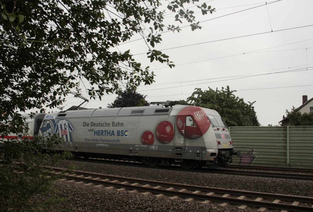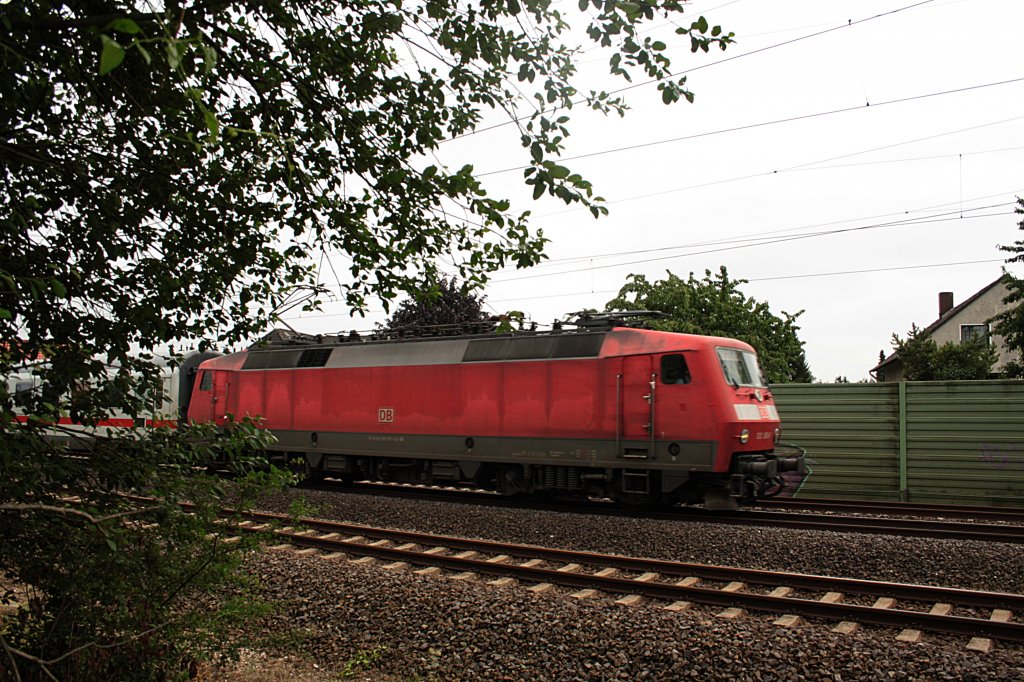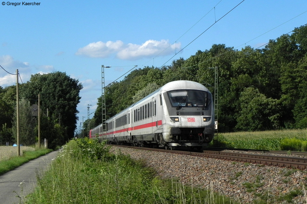 101 029-7 mit dem IC 2360 (Stuttgart-Bruchsal-Karlsruhe) zwischen Weingarten und Karlsruhe-Durlach. Aufgenommen am 14.07.2011. Es war wohl eine Ersatzgarnitur, die an diesem Tag zum Einsatz kam, denn die Reihung des Zuges ist etwas ungewöhnlich: 101, 7x Apmz (1. Klasse-Großraumwagen), Bpmbdzf (IC-Steuerwagen).