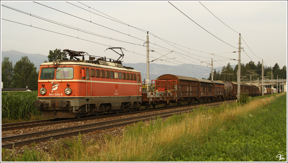 1042 020 fährt mit Güterzug 55050 von Villach Gvbf nach Wien Zvbf. Zeltweg 13.7.2011