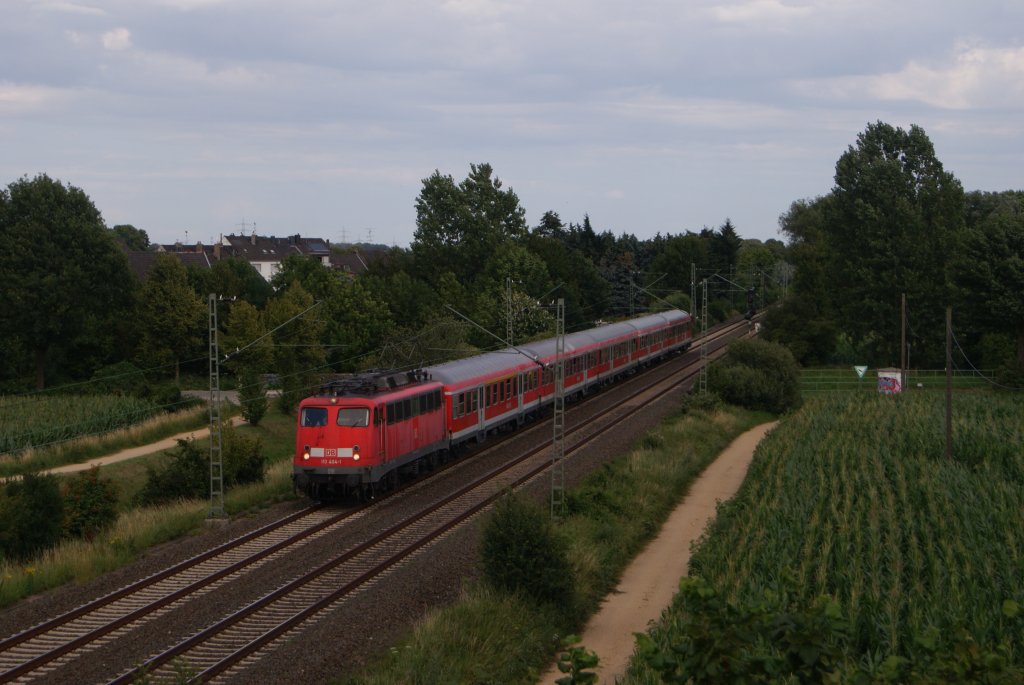 Die 111 156-4 mit RE 4 nach Aachen ist hier bei der Durchfahrt in Korschenbroich zu sehen. Sonntag 17.7.2011