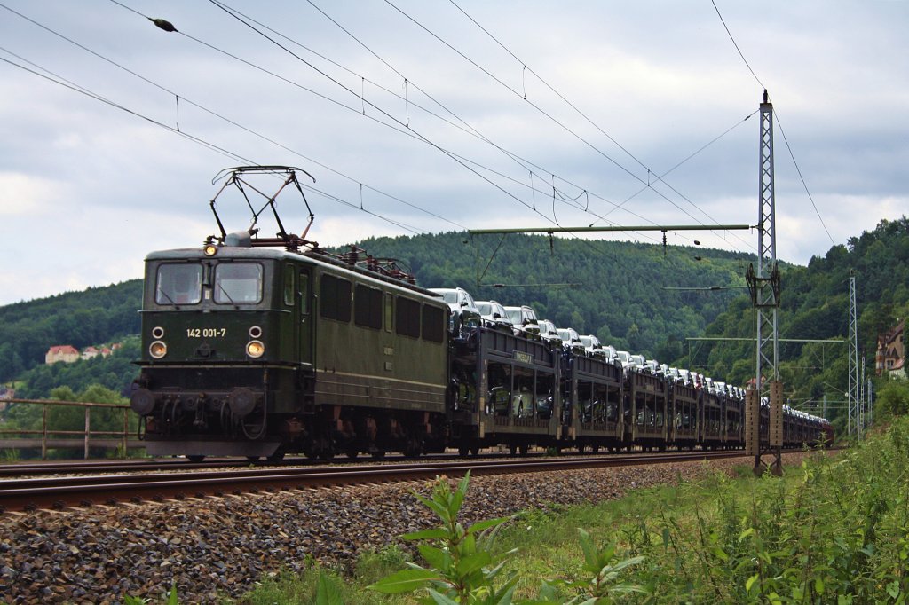 142 001-7 ist am 14.07.'11 mit dem fast täglichen Skoda-Zug im Elbtal nahe Königstein unterwegs