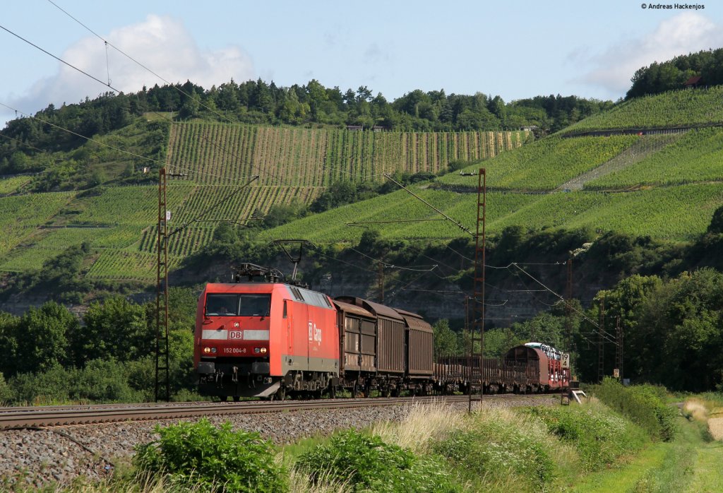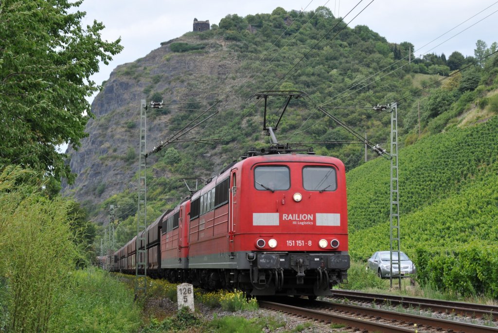 151 006-4 mit einem LKW-Zug bei Leutesdorf am Rhein. Aufgenommen am 16/07/2011.