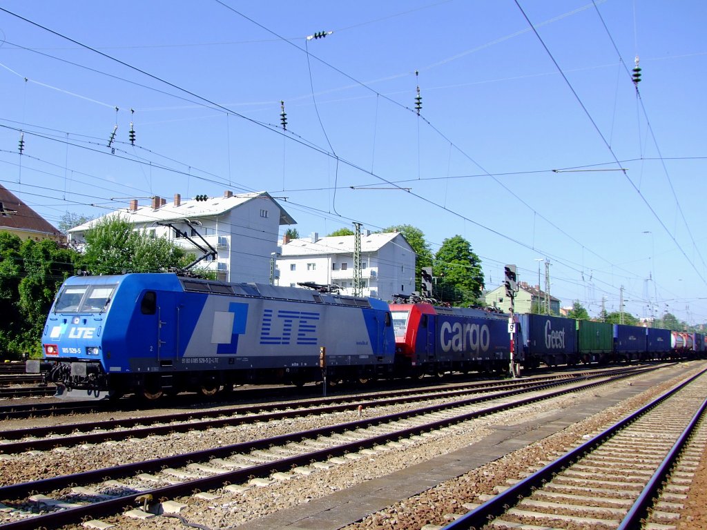185 529-5 (LTE) zieht die SBB-cargo 482 047-8, sowie einen Containerzug bei Passau Richtung Österreich;110716