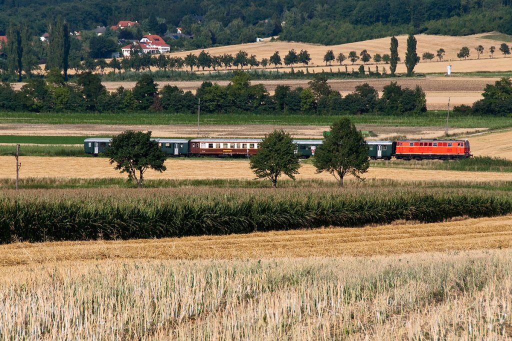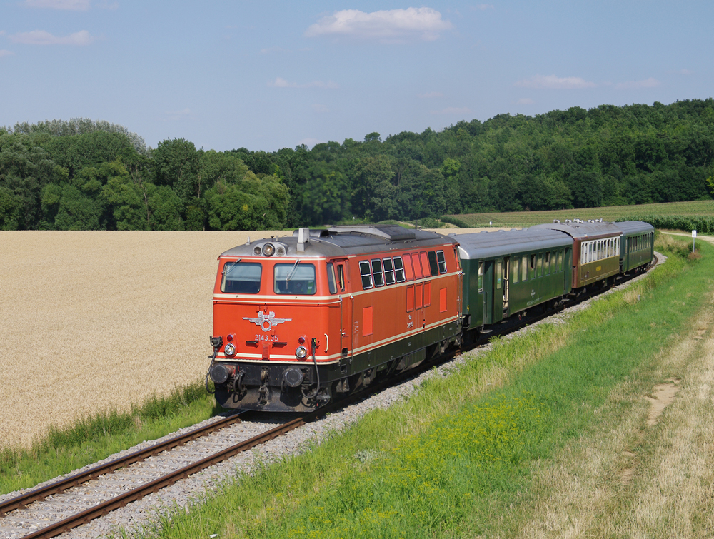 Die Getreideernte in Niederösterreich hat bereits begonnen, wie man sieht. Vor einigen, bereits gemähten Feldern in Hetzmannsdorf fährt 2143.35 mit EZ 7399 von Ernstbrunn nach Wien Südbahnhof (Ost). Die Aufnahme entstand am 16.07.2011.