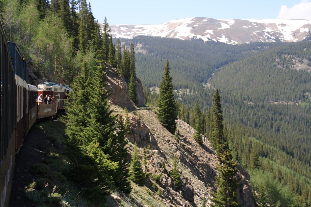 29.6.2011 Leadville, CO. Ein Zug der Leadville, Colorado & Southern Railroad zurück zum Ausgangspunkt. Klasse Aussicht, die sich durchaus mit der Silverton & Durango messen kann. Ausserdem: offener Wagen und keine kleinlichen Sicherheitsbestimmungen (Sitzen bleiben!) wie im Osten oft erlebt. Loktyp unbekannt - Tipp erbeten