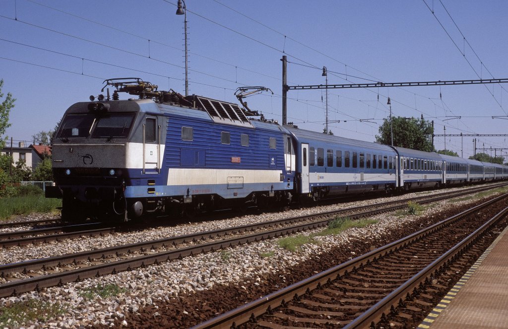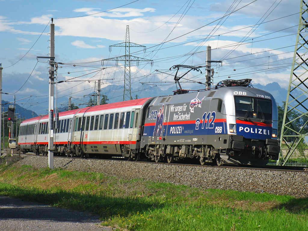 ENDLICH die Polizei-Lok erwischt: Sie fuhr von Selzthal mit EN 464 nach Feldkirch und anschließend kam sie mit 3 Wagen als 35992 nach Wolfurt. Hier kurz vor der Hst. Schwarzach in Vorarlberg. Laut Umlaufplan sollte sie heute den Gegenzug EN 465 wieder zurück nach Selzthal bespannen. (17.07.11)
