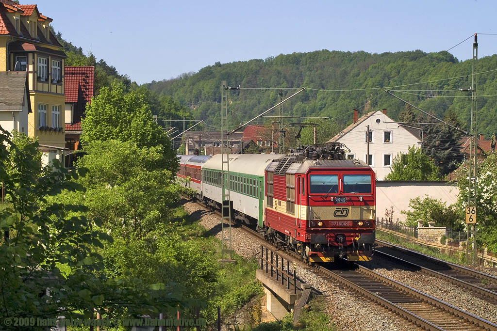 371 004 bringt an diesem 2. Mai 2009 einen Zug, der schon längst vorbei gefahren sein sollte. So hat mich diese Garnitur mit tschechischen Wagen hinter der Lok an diesem Tag überrascht, denn ich hatte es auf eine S-Bahn abgesehen, die fotografiere ich ja am liebsten ...grrrrr... Der Gartenabfallhaufen, auf dem ich stehe und ohne den das Motiv nicht oder nicht so zu machen ist, lag in Pötscha-Wehlen.