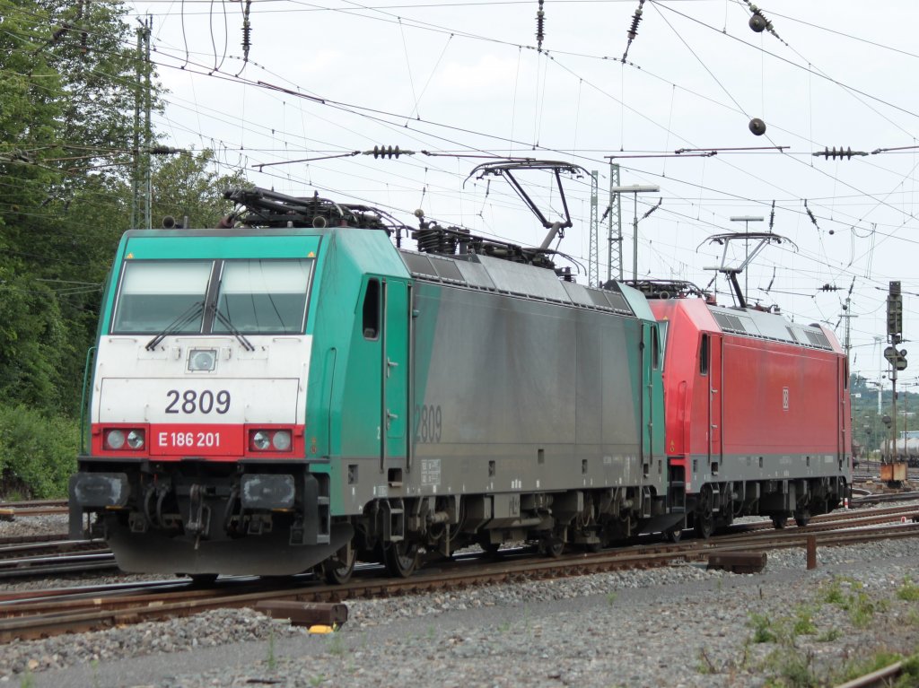 Cobra 186 201 (2809) und 185 364-7 rangieren am 16.07.2011 in Aachen West. Die 185er hat die kalte Cobra vor einem Güterzug von Gremberg nach hier gezogen. Jetzt wird noch rangiert damit beide Lok`s abgestellt werden können.