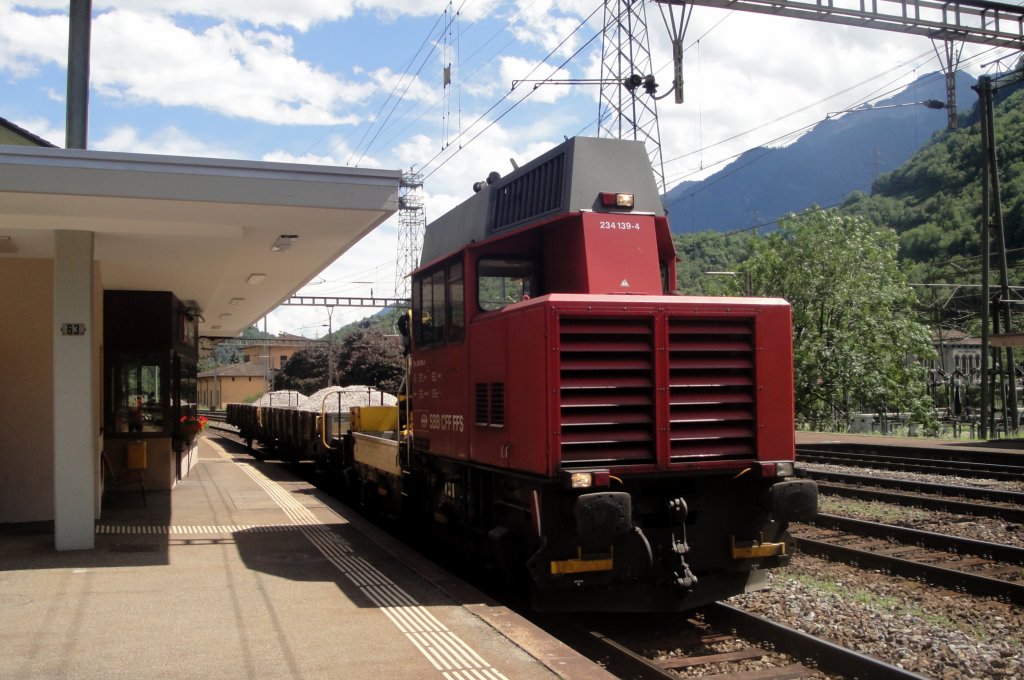 Der Tm 234 139-4 erreichte soeben am 15.07.11 mit 2 beladenen Xs den Bahnhof Lavorgo.