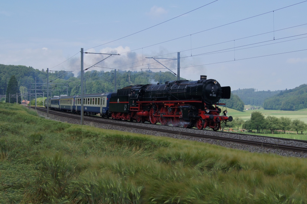 Die Sonne liess mich am 4.6.11 im dümmsten Moment im Stich: Als die Pacific 01 202 nämlich angedampft kam, verschwand sie hinter einer Wolke und tauchte einige Sekunden später wieder auf. Das Bild wurde bei Burgdorf aufgenommen.