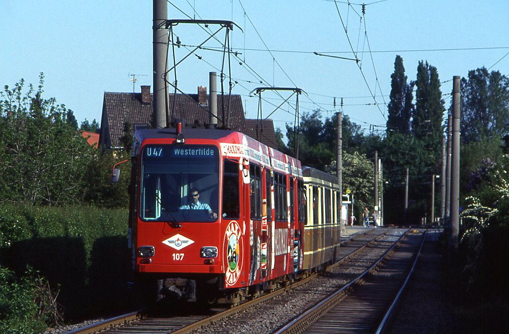 Ein Gespann aus Dortmunder Tw 107 und 113 auf dem Weg nach Westerfilde. Aufnahme in Huckarde an der Hst. Mailoh, 14.05.1992.