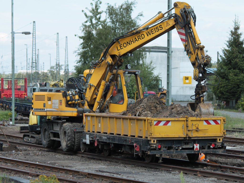 Ein Liebherr Zweiwegebagger von der Firma Leonard Weiss hebt am 15.07.2011 in Stolberg Hbf neben den Gleisen ein Loch aus und schaufelt den Abraum in den mitgeführten Kleinwagen.