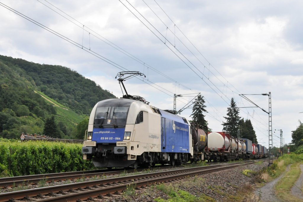 ES64U2-064 der Wiener Lokalbahnen mit einem gemischten Güterzug bei Leutesdorf in Richtung Norden. Aufgenommen am 16/07/2011.