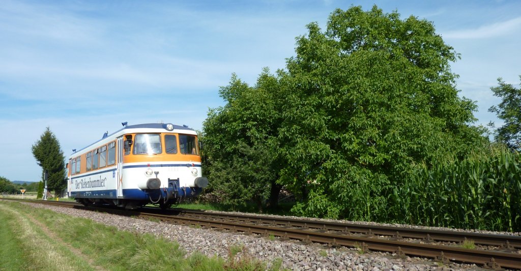 Im Abendlicht des 16. Juli 2011 fährt VT 28 bei Riegel seinem Feierabend entgegen.