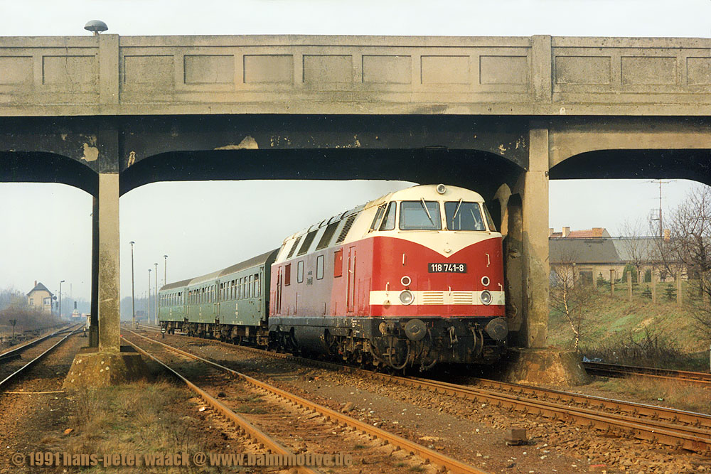 Im März 1991 macht sich 118 741 vom Bw Kamenz auf den Weg nach Kamenz und fährt dabei unter diesen kleinen Brücke in Strassgräbchen durch.