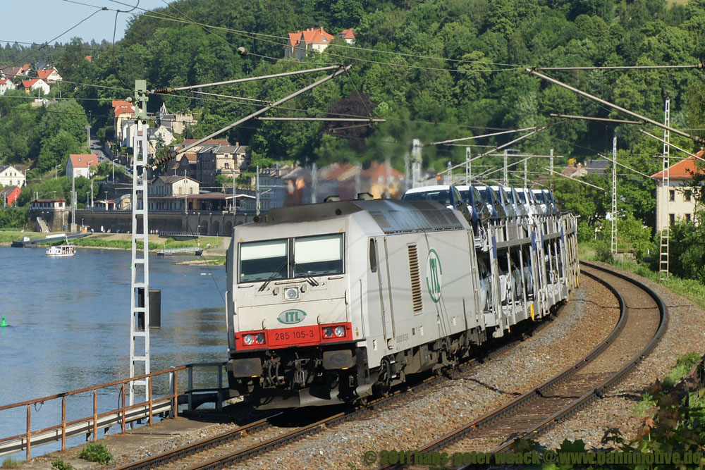 Mit Diesel unterm Fahrdraht. ITL 285 105 bringt einen Autozug in Richtung Dresden. Königstein/Sachsen, 25.05.11.
