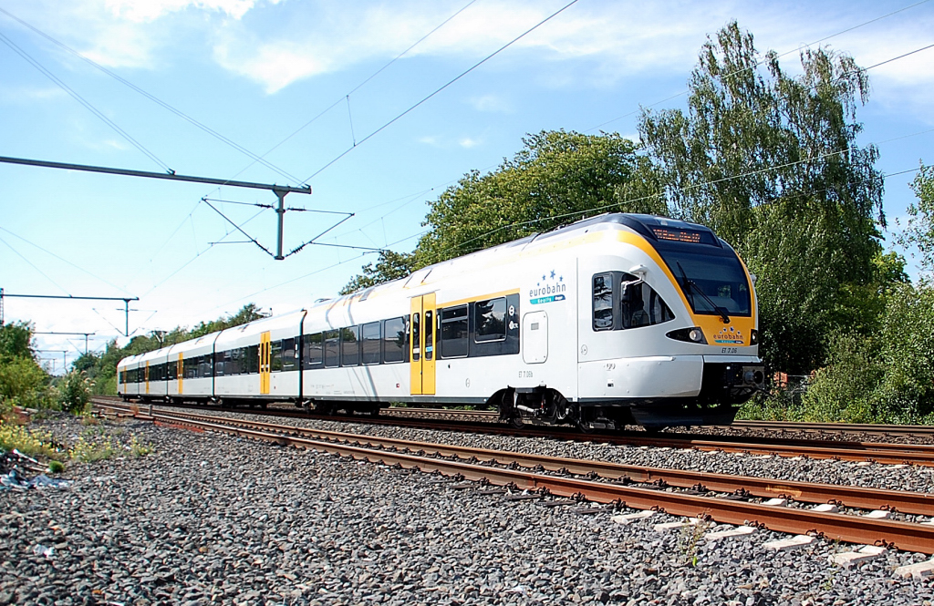 Nach Hamm geht die Fahrt des Eurobahntriebzuges der als RE 13 hier durch Korschenbroich an diesem Sonntagnachmittag den 17. Juli 2011 eilt.