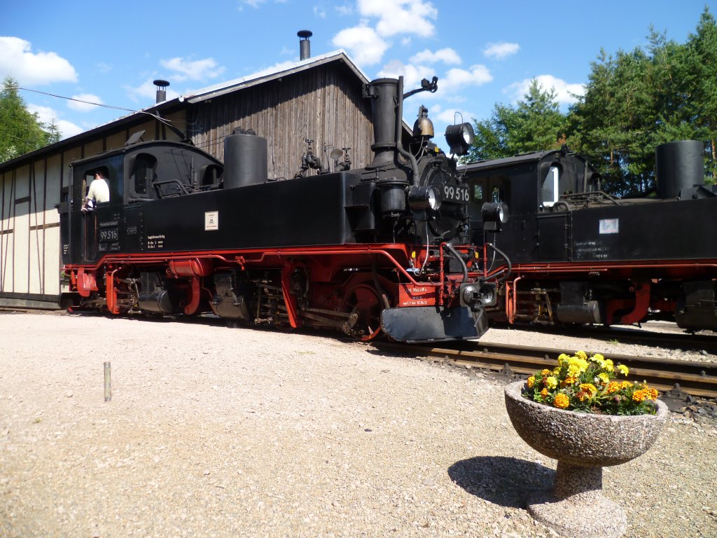 Sommerdampf in Schönheide am 16.07.11, hier steht 99 516 rangiert vor dem Lokschuppen in Schönheide.