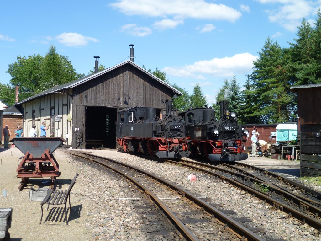 Sommerdampf in Schönheide am 16.07.11, hier stehen 99 585 und 99 516 vor dem Lokschuppen in Schönheide.