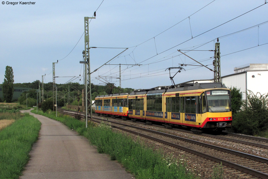 Wagen 812 "Europabad Karlsruhe" und Wagen 893 "KVV Quattro" als S5 nach Bietigheim-Bissingen bei Illingen (Württ.).