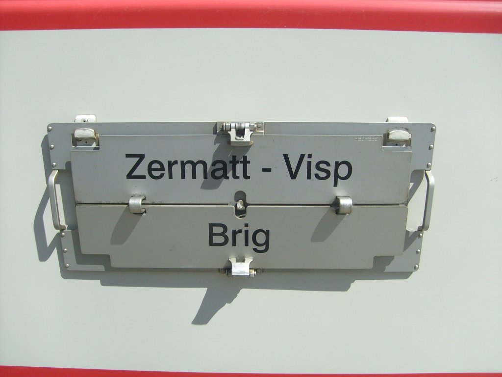 Zuglaufschild eines Regionalzuges der MGB nach Zermatt am 17.7. im Bahnhof Brig