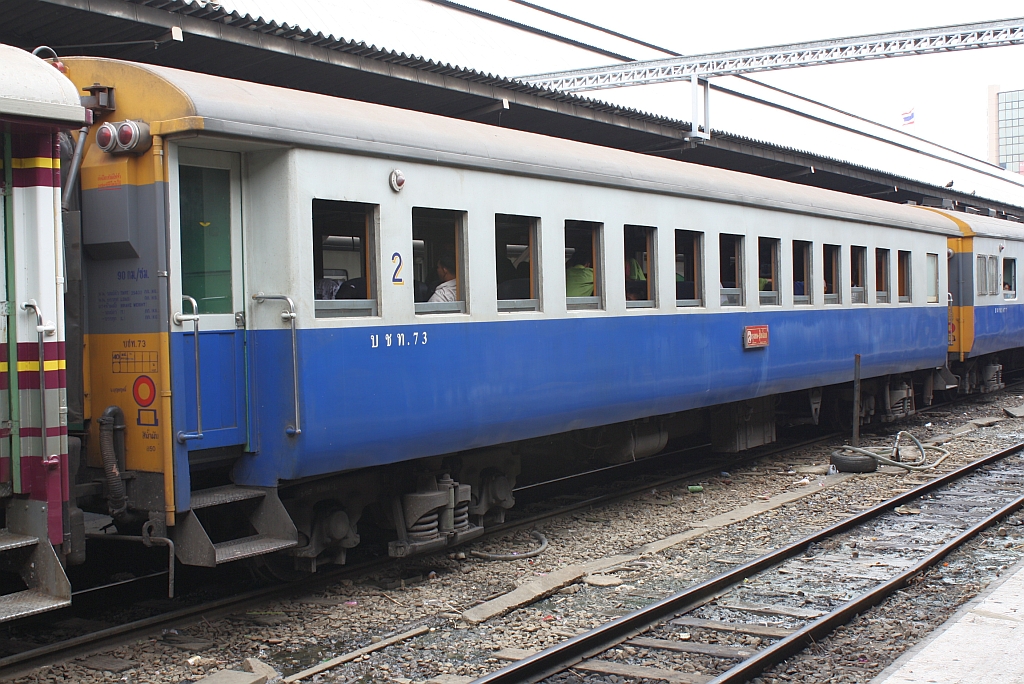 บชท.73 (บชท. =BSC./Bogie Second Class), Baujahr 1957, Kinki Sharyo/Japan, eingereiht im RAP 171 nach Sungai Kolok am 18.März 2011 im Bf. Hua Lamphong.