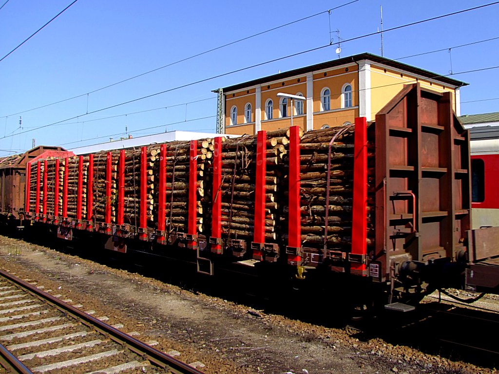 Roos-t 31803525750-6 ist mit Rundholz beladen, und rollt in einem gemischten Güterzug eingereiht, bei Passau Hbf. Richtung Österreich;110716
