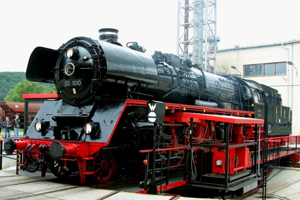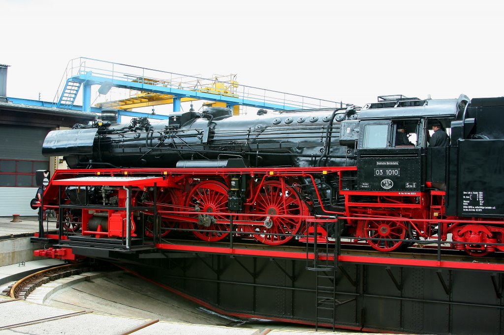03 1010 am 02.07.2011 kurz vor der offiziellen Übergabe nach erfolgter Hauptuntersuchung auf der Drehscheibe im Dampflokwerk Meiningen. (Aufnahme erfolgte legal im Rahmen einer offiziellen Veranstaltung!) Das Dampflokwerk war an diesem Tag für Besucher geöffnet!