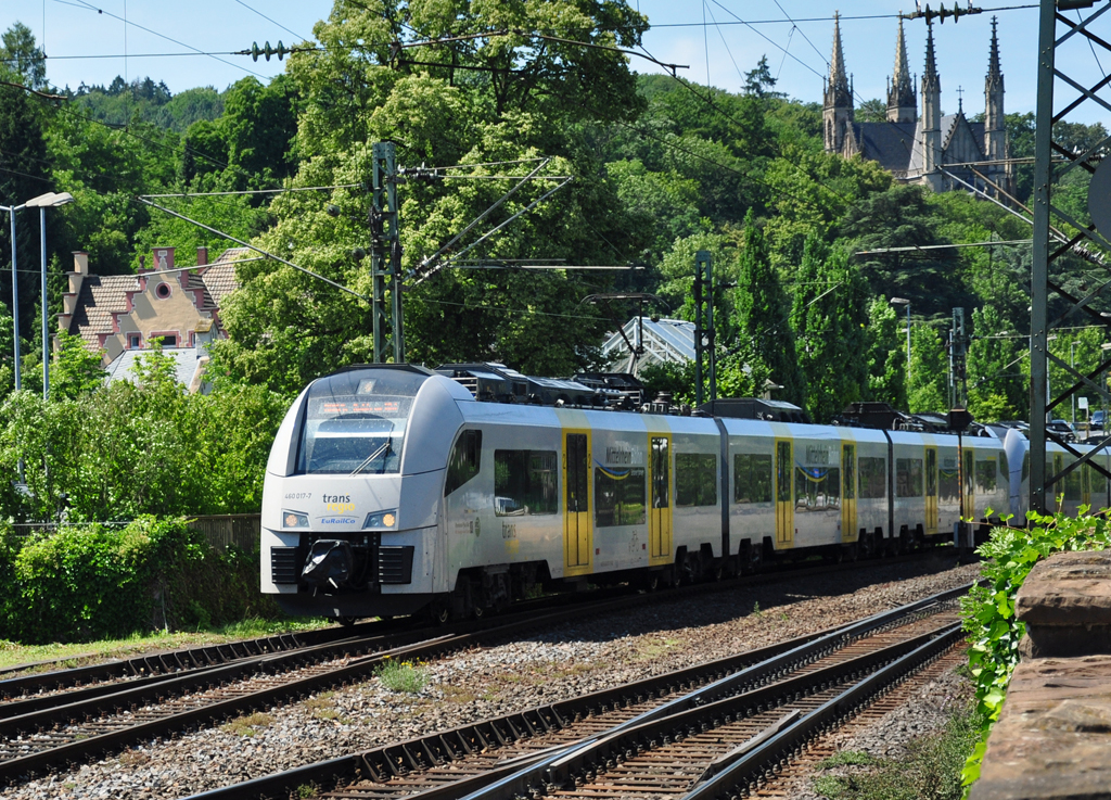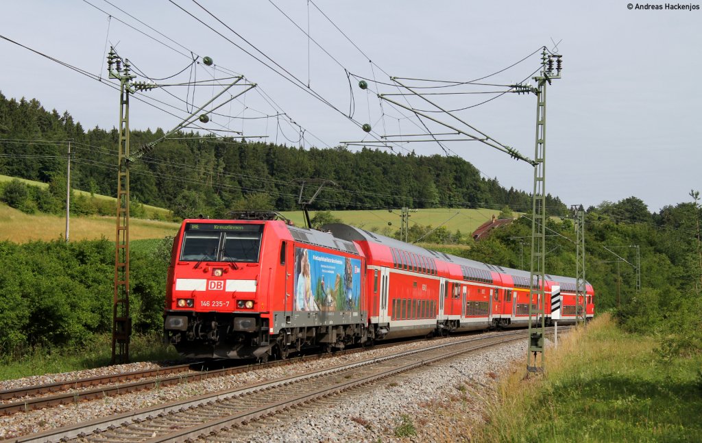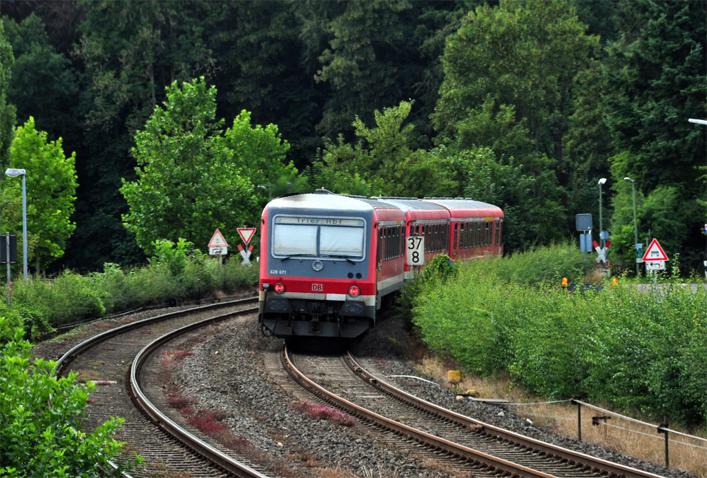 Durch die Weinberge des Saartals fährt hier der RE12015 Saarbrücken-Trier-Koblenz. Die Doppelstockgarnitur ist mit je einer 143 vorn und hinten bespannt.
