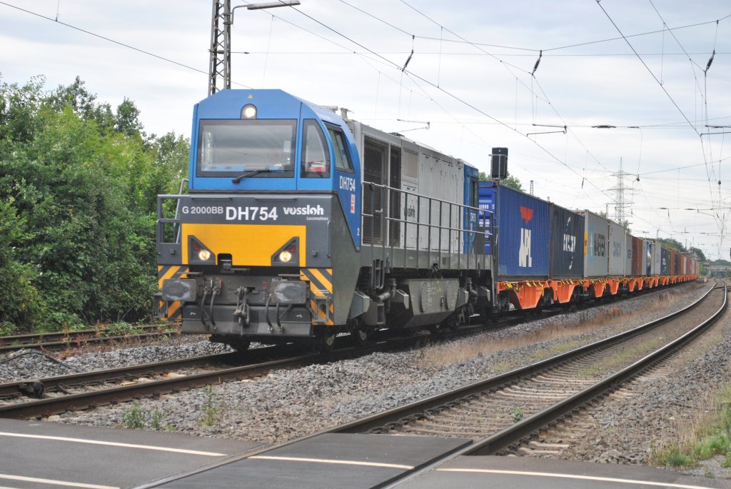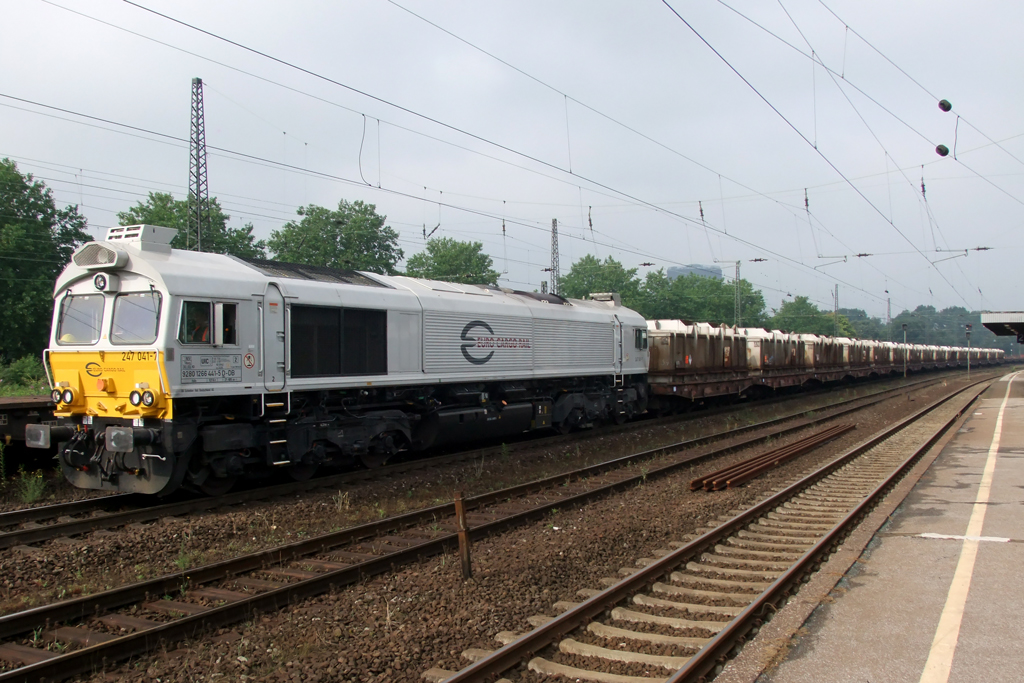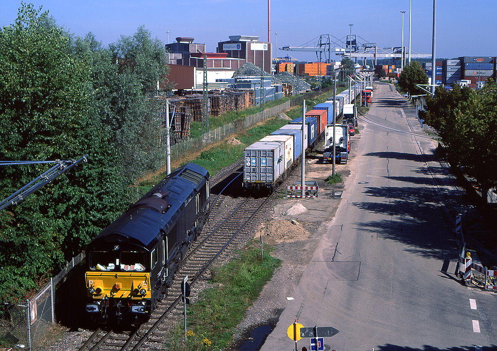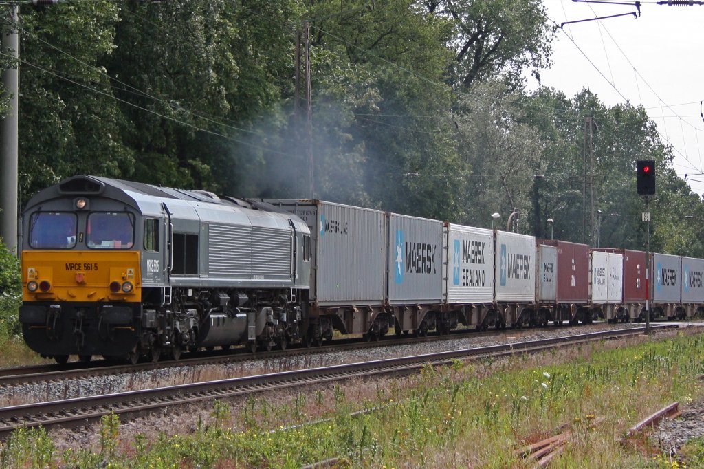 Die MRCE 561-5 kämpft sich am 16.7.11 mit einem sehr langen Containerzug durch Ratingen-Lintorf.