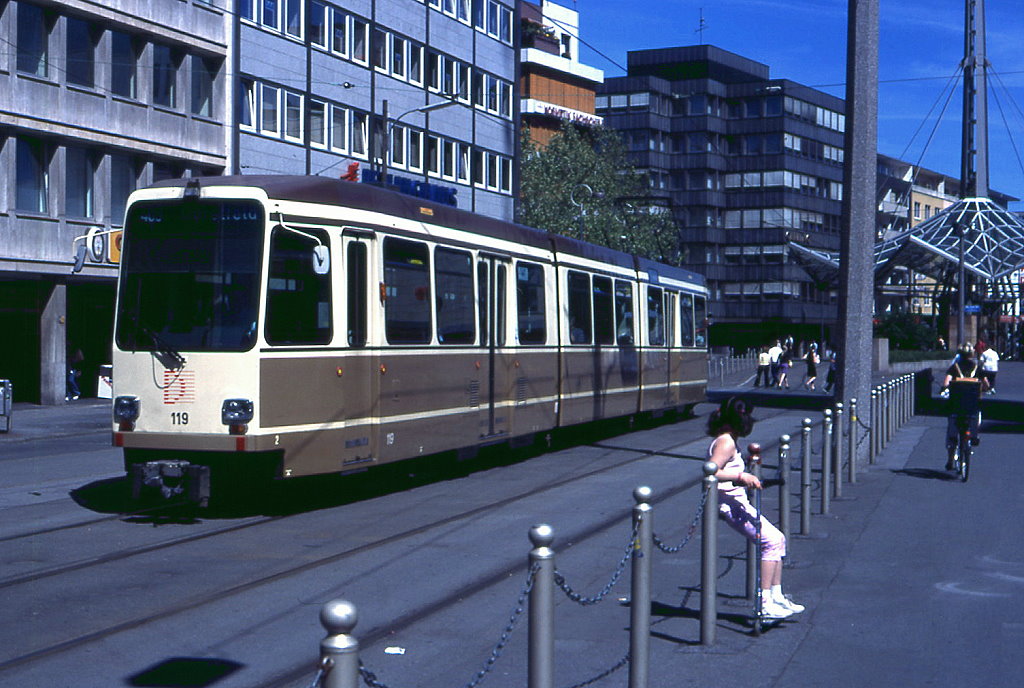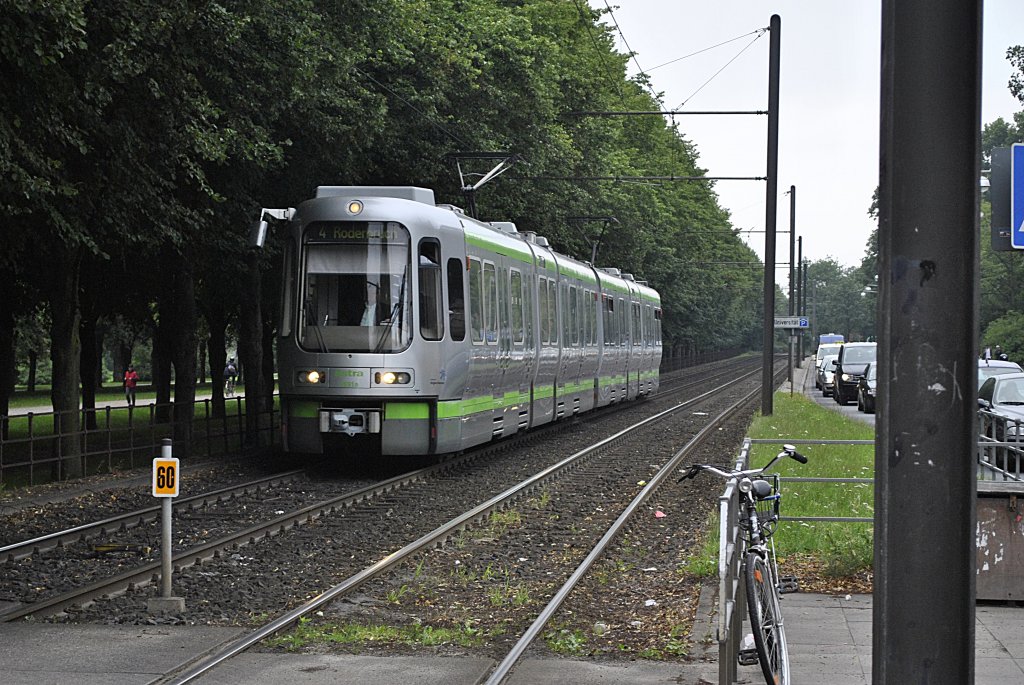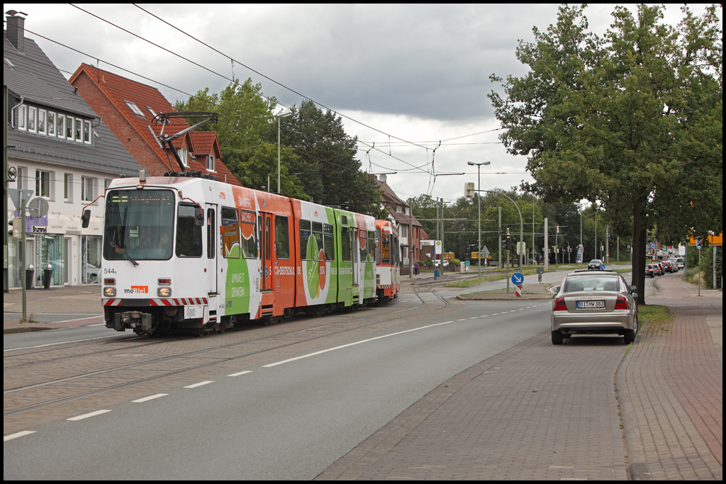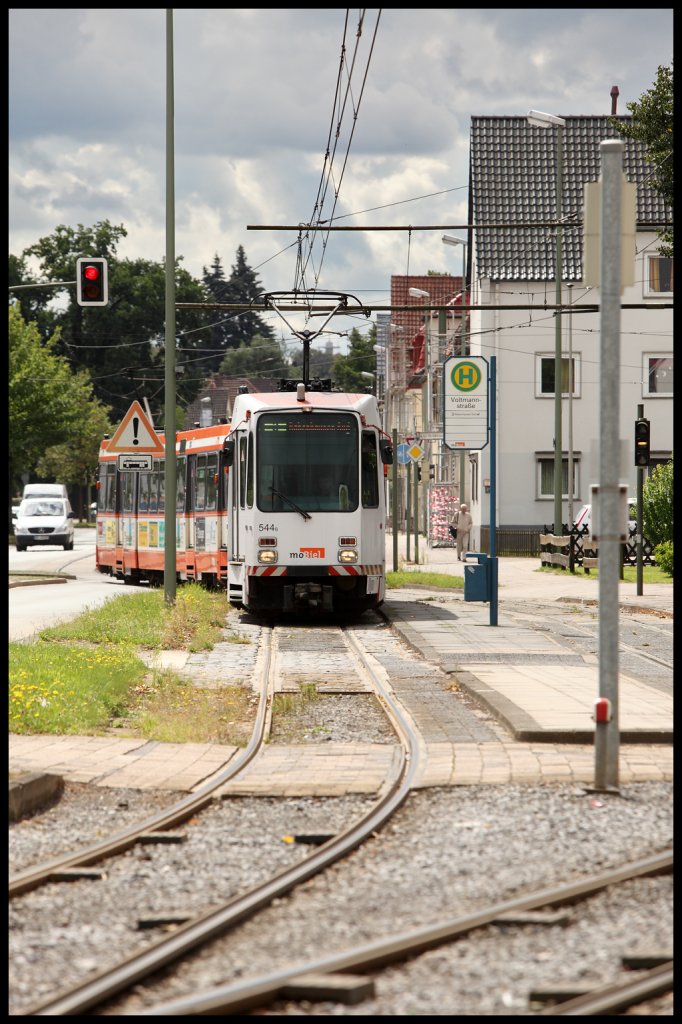 Ein Stadtbahnwagen Typ M8D, erreicht die Haltestelle Voltmannstraße. (Stadtverkehr Bielefeld am 18.07.2011)