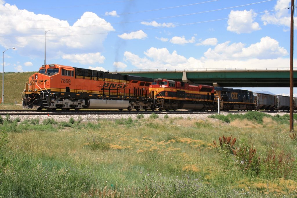 3.7.2011 Boulder, CO. BNSF ES44DC 7869 mit einer KCS + CSX vor einem Güterzug Richtung Denver.