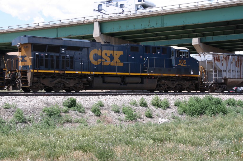 3.7.2011. CSX 906(ES44AC)als 3. im Bunde vor einem Güterzug in Boulder, CO, Richtung Denver.