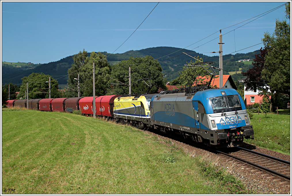 Adria Transport 1216.922 und CargoServ 1216.931 fahren mit Stahlrollenzug SGAG 93277 (Umleiter-Zugnr. vom 47209) von Linz Voest Alpine nach Tarvis. Aufgrund der 24-Stunden-Tauernsperre wurde der CargoServ Stahlrollenzug 47209 über den Pyhrn, den Schoberpass und den Neumarkter Sattel umgeleitet. Und glücklicherweise konnte der Zug aufgrund der extremen Steigungen am Pyhrn außerplanmäßig in Tandem-Leistung aufgenommen werden. Micheldorf, 17.07.2011