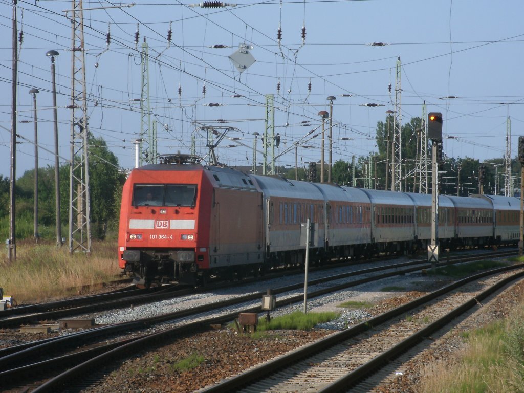 Der Nachtzug CNL 1258 von Binz nach Zürich,gezogen von 101 064,verließ am 16.Juli 2011 Bergen/Rügen.