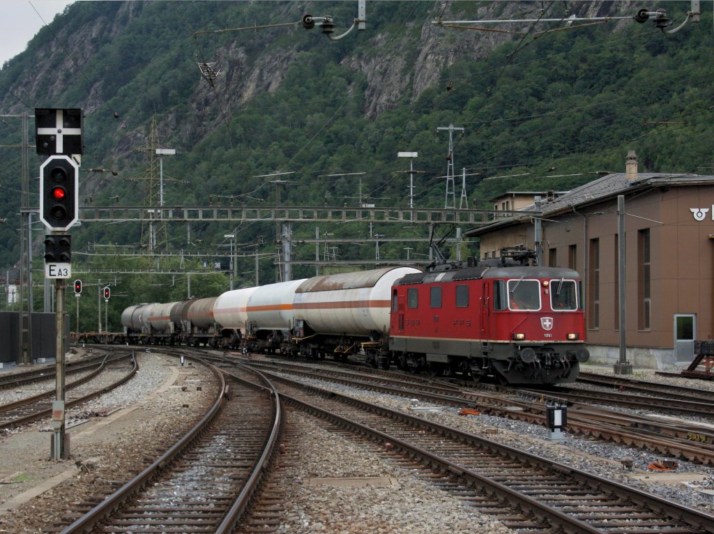 SBB - Re 4/4 11311 mit Bauzg bei der durchfahrt im Bahnhof Spiez am 01.07.2011