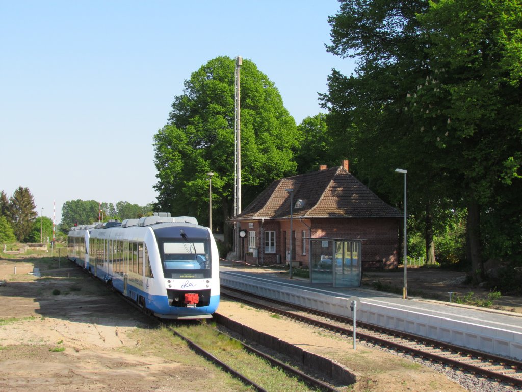 Doppeltraktion Lint der OLA Schwerin im Bahnhof von Plate am 07.05.2011 an der Strecke Parchim - Schwerin HBF
