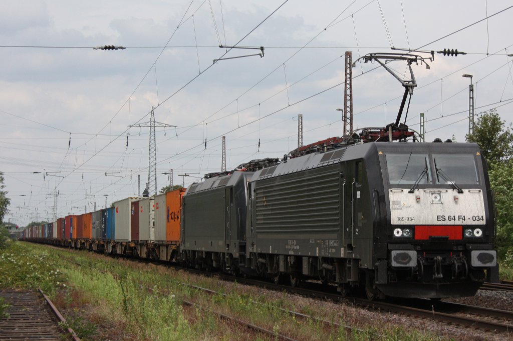MRCE Dispolok ES 64 F4-034 (189-934) zieht am 16.7.11 die abgebügelte 185 571 und einen Containerzug durch Ratingen-Lintorf
