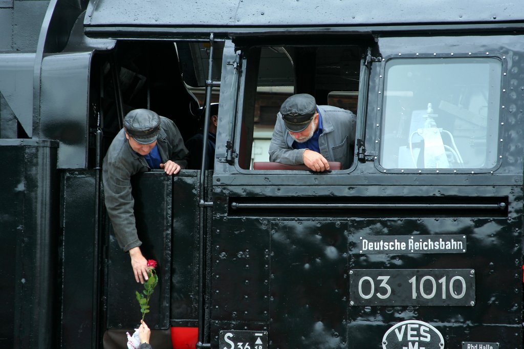 Nette Geste! Eine Rose als Glücksbringer für das Lokpersonal (aufgenommen im Rahmen der offiziellen(!!) Übergabe nach der Hauptuntersuchung am 02.07.2011 im Dampflokwerk Meiningen). Das Dampflokwerk war an diesem Tag für Besucher geöffnet!