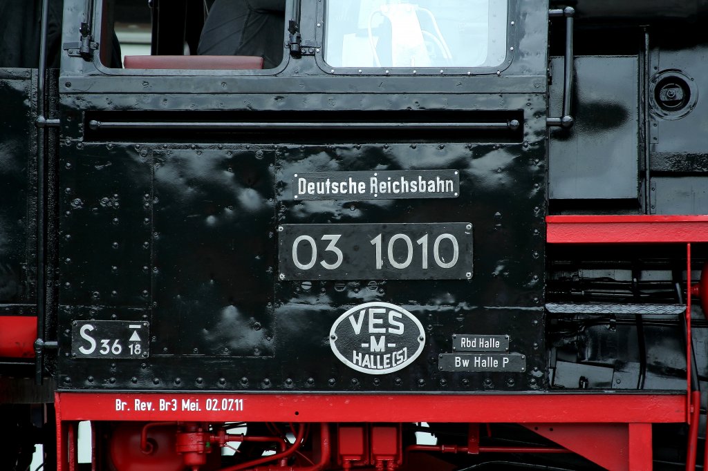 03 1010 Komplettansicht der Lokbeschilderung. (aufgenommen am 02.07.2011 im Dampflokwerk Meiningen im Rahmen der offiziellen Übergabe der Maschine nach der Hauptuntersuchung. Das Dampflokwerk war an diesem Tag für Besucher geöffnet!)
