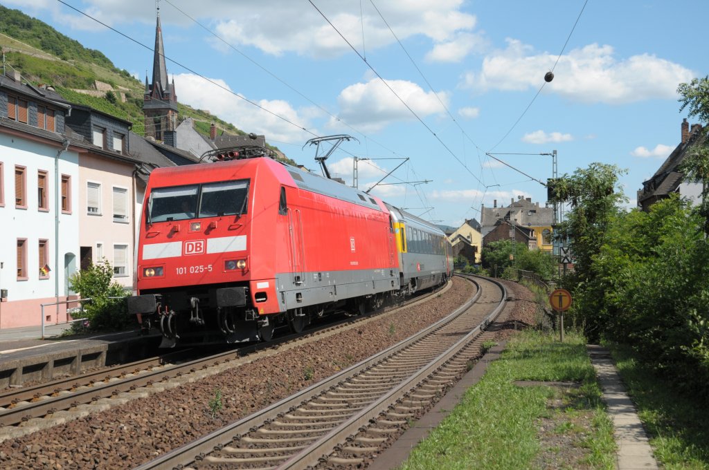 101 025 am 26.06.11 mit einem rechtsrheinisch umgeleiteten EC aus der Schweiz in Lorchhausen